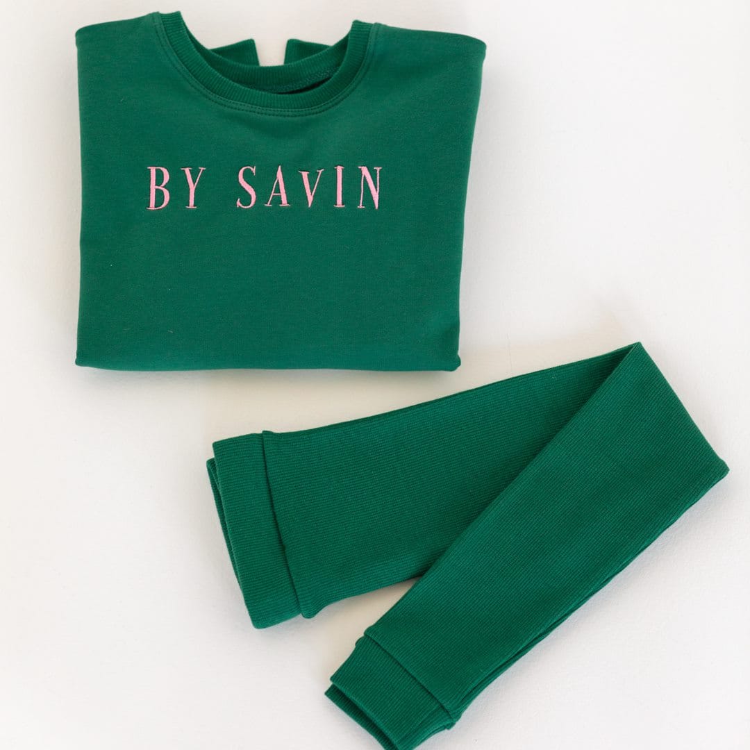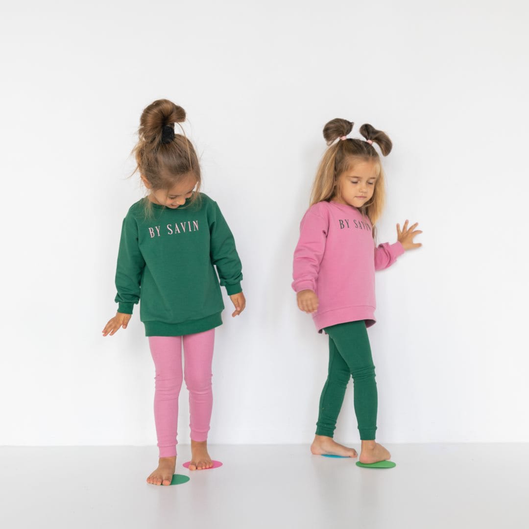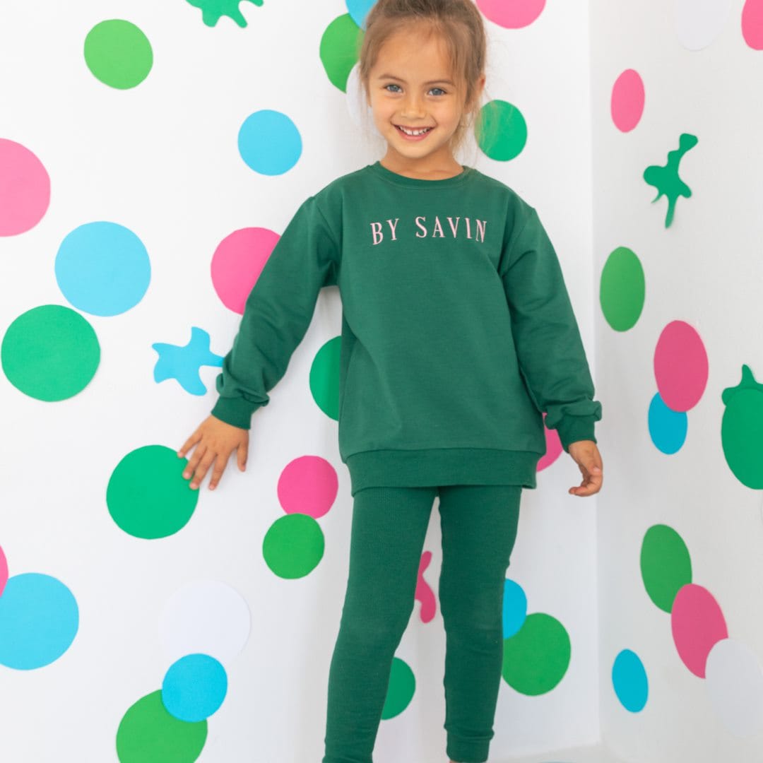 Komplet składający się z luźnej bluzy (dzianina dresowa) i leginsów (dzianina prążkowa). Obie dzianiny produkcji polskiej posiadające certyfikat OEKO-TEX 100. Dzianina dresowa(94% bawełna, 6% elastan) jest ciepła, miękka i oddychająca. Leginsy z dzianiny prążkowej(95% bawełna, 5%elastan) są ciepłe , miękkie i rozciągliwe.