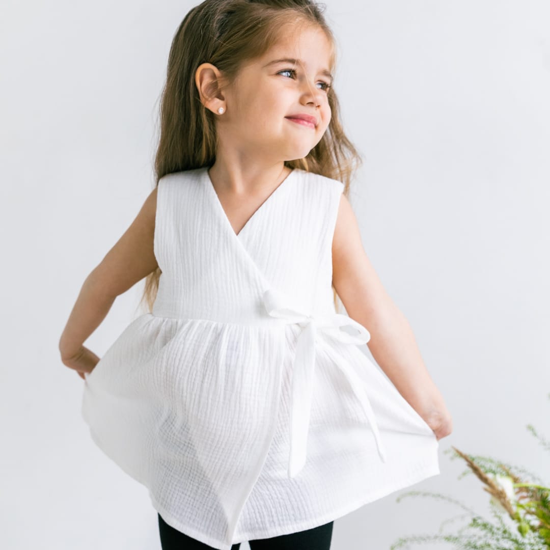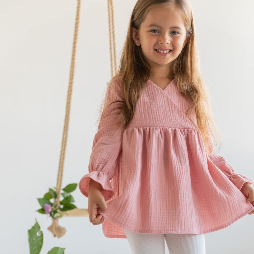 Muślinowa tunika w kolorze różu (100% bawełna z certifikatem GOTS). Muślin uważany jest za najdelikatniejszą tkaninę, charakteryzuje się lekkością i miękkością. Skóra dziecka oddycha.
