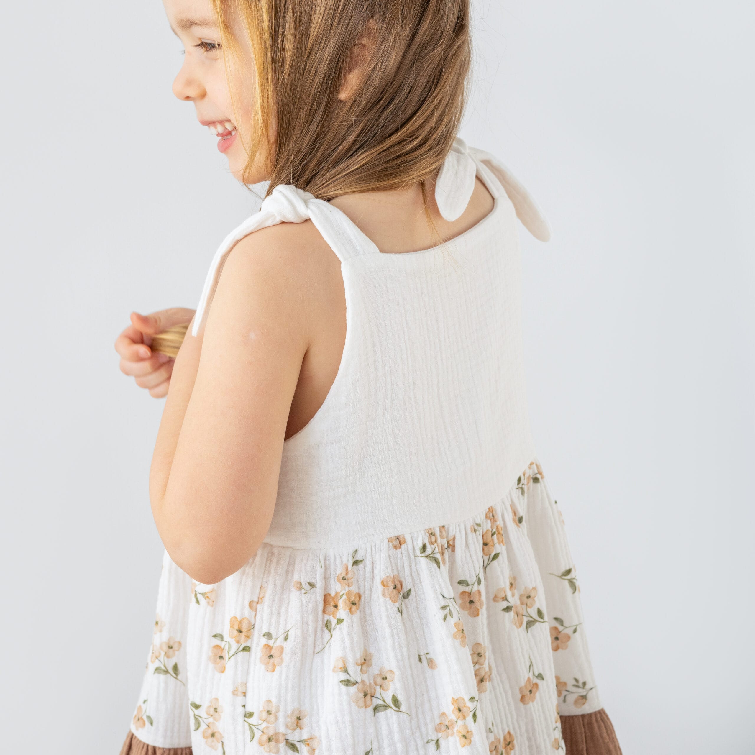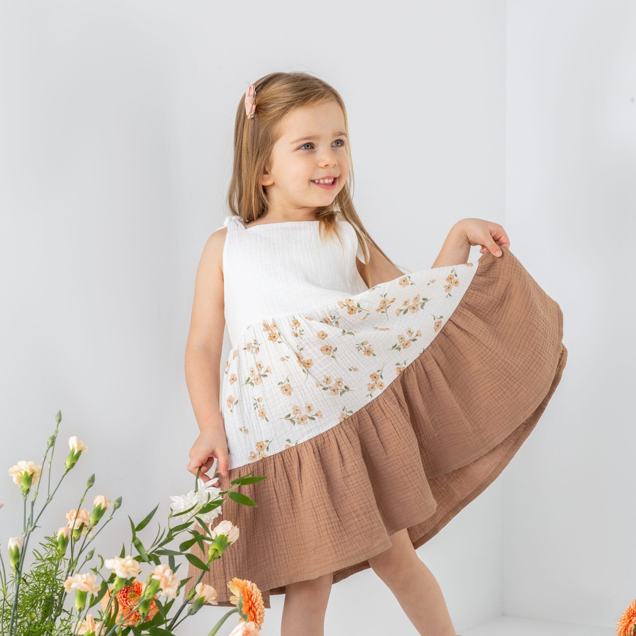 Sukienka wykonana z muślinu bawełnianego. Tkanina posiada certyfikat OEKO-TEX 100. Print na tkaninie jest nasz autorski, dostępny tylko u nas. Tkanina jest lekka, zwiewna i oddychająca, nie wymaga prasowania.